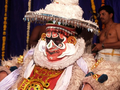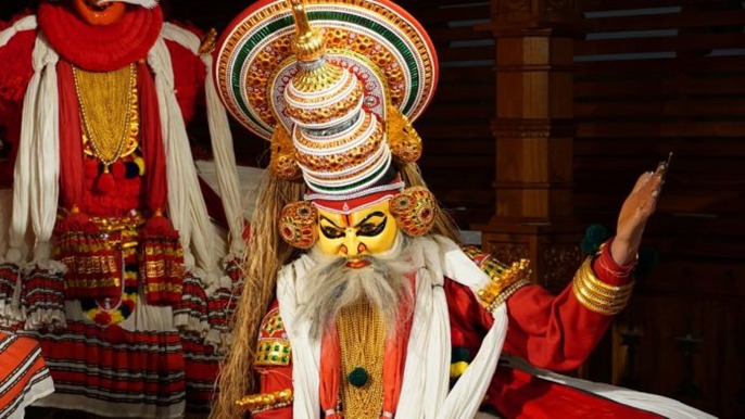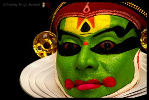 Kathakali has unique make-up that is very elaborate and requires another person’s help to complete the make-up. Once the make-up is on, the artists are transformed into the characters and no longer remain as the artist. Some unique features of their make-up is the papier-mache that is used to highlight the jaw bone, the different coloured beards, the different types of head gear made of wood or papeir-mache. Even until today kathakali dancers use natural products to make their face paints.
