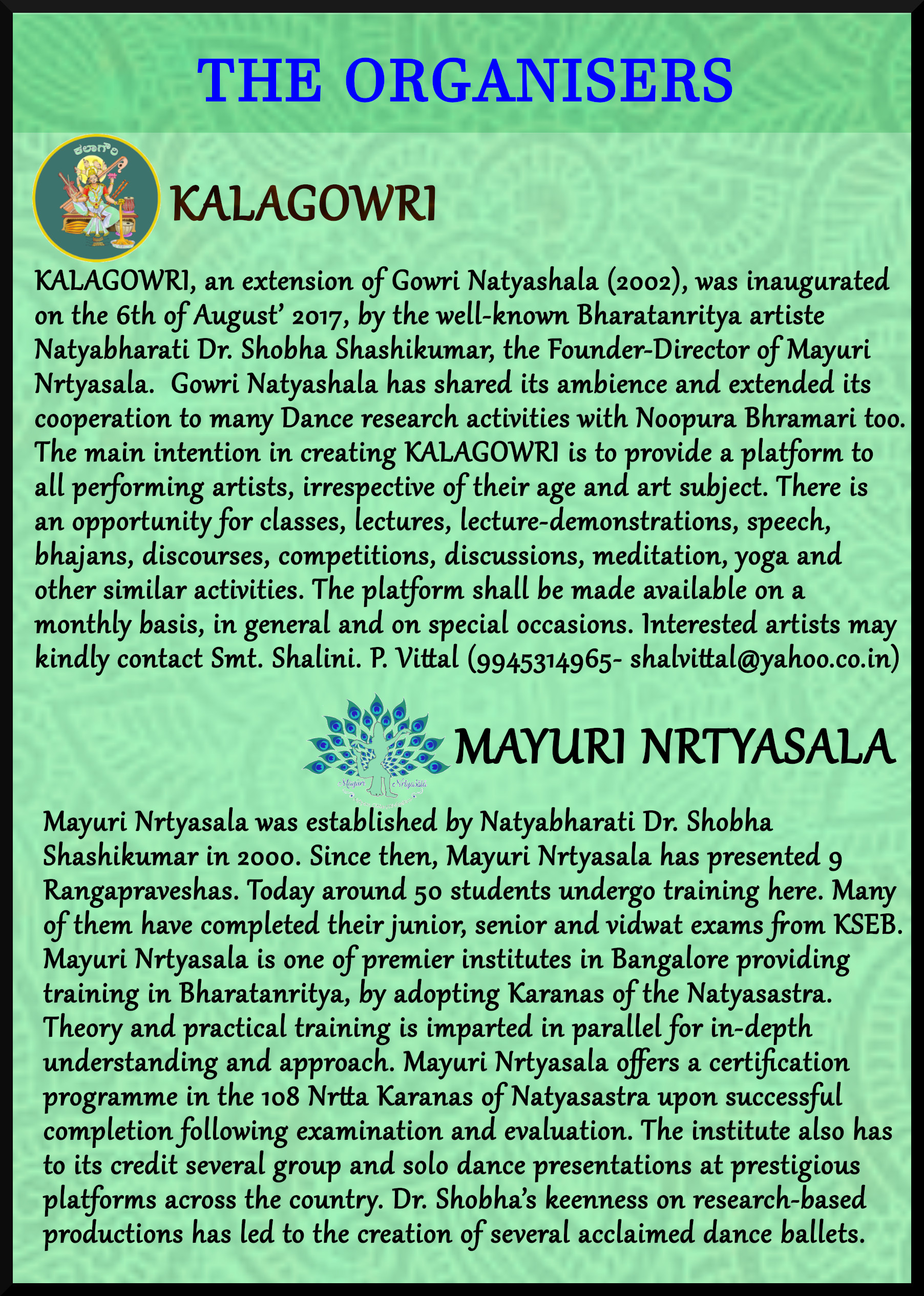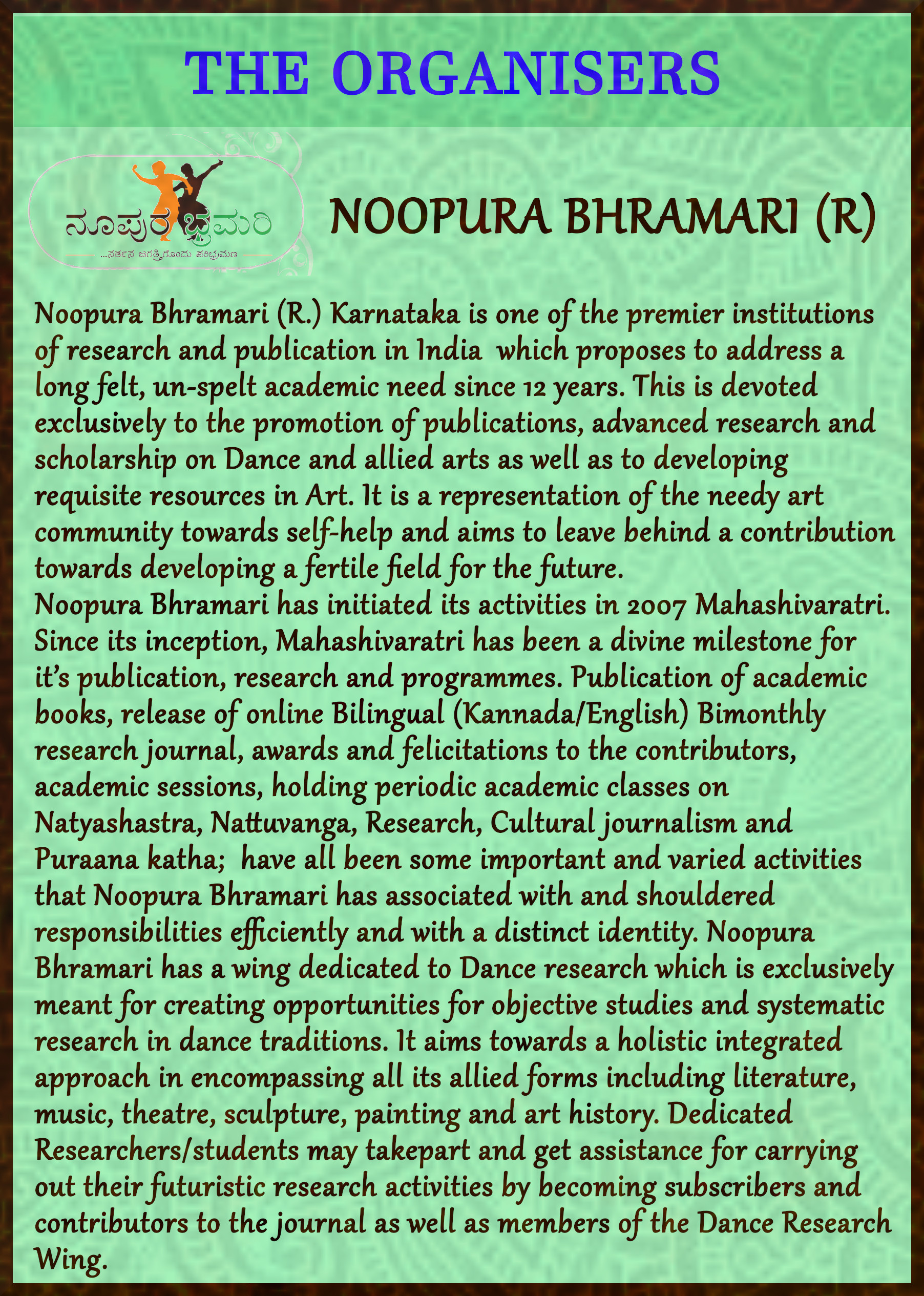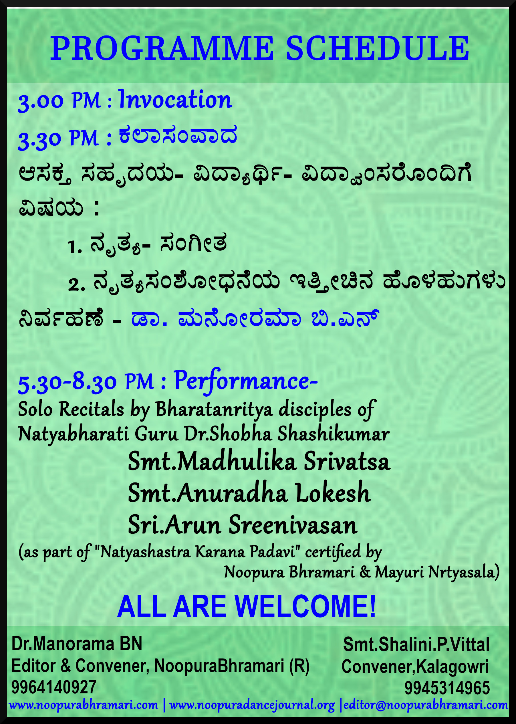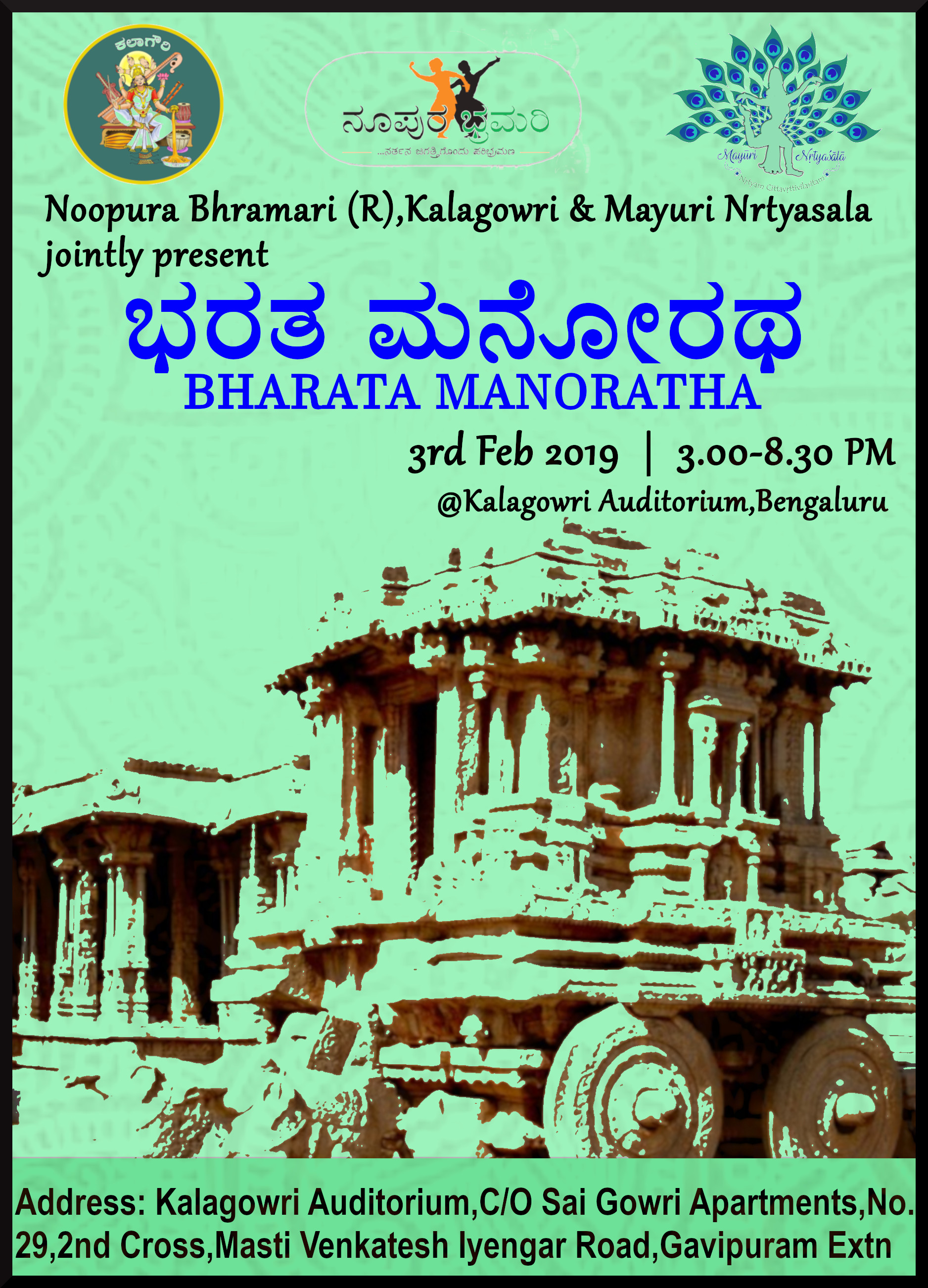 Noopura Bhramari (R.), Kalagowri and Mayuri Nrithyashala joinly organising ‘Bharata Manoratha’ – An evening on the thoughts of Bharatamuni of Natyashastra on February 3rd, 2019 at Kalagowri Auditorium, Basavanagudi, Bengaluru. Programme scheduled by 3pm to 7.30pm