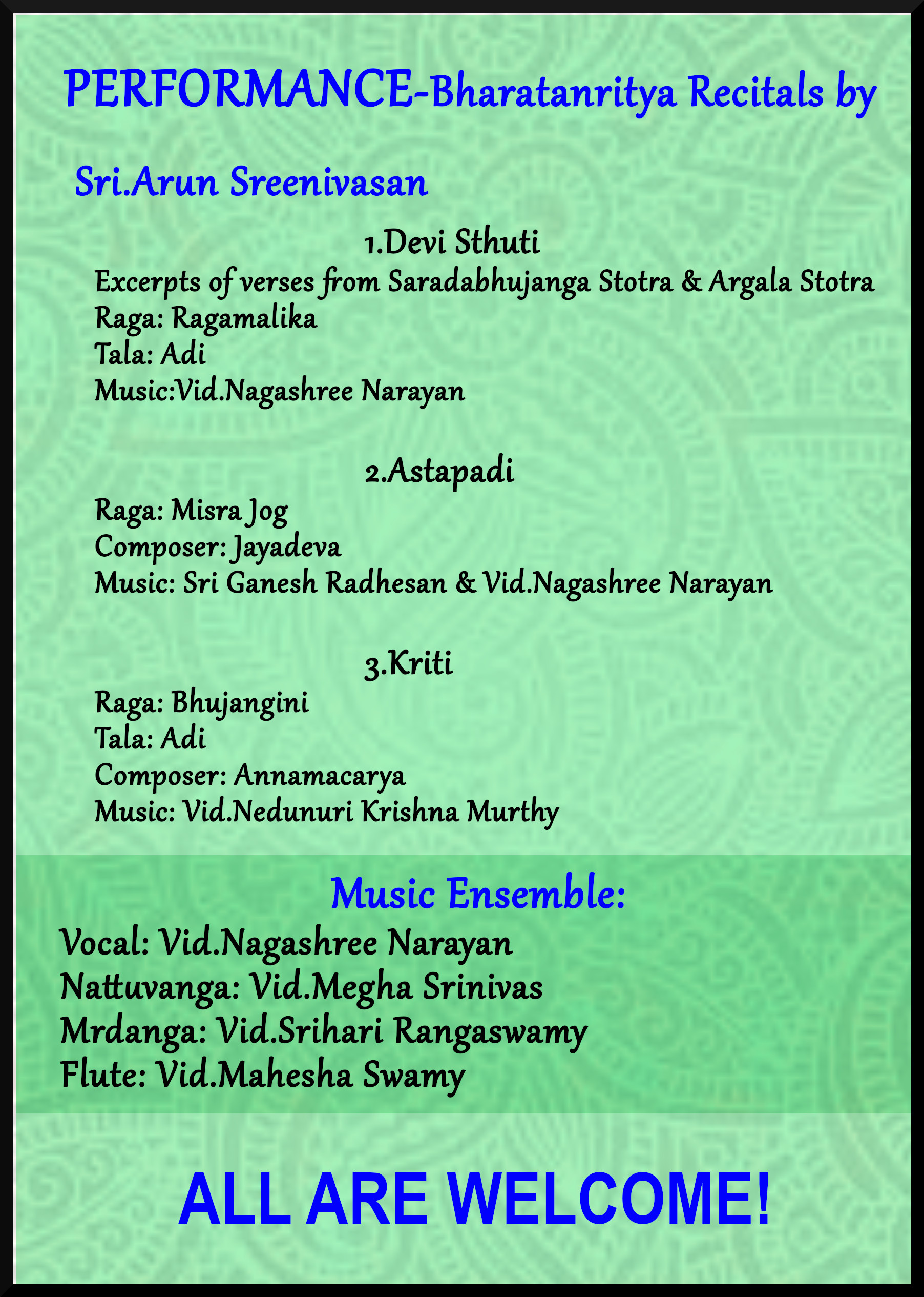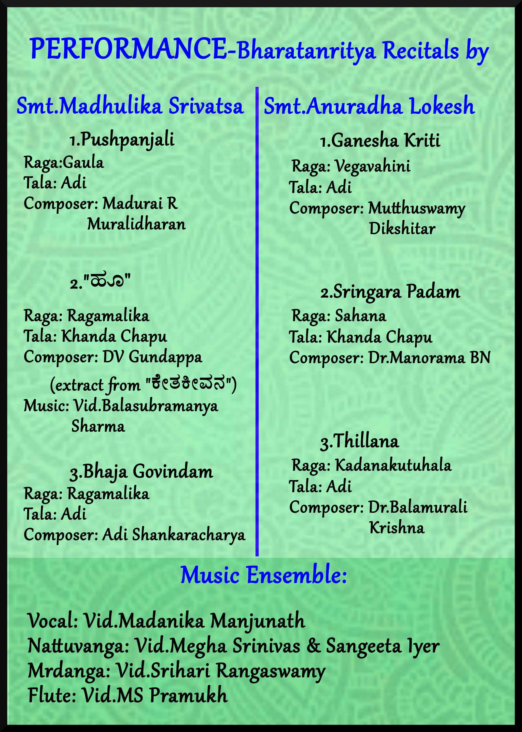 ನಾಟ್ಯಶಾಸ್ತ್ರದ 108 ಕರಣಗಳ ಪದವಿಯ ಆಂಶಿಕ ಪೂರ್ಣತೆಗಾಗಿ ಸ್ವಂತ ಸಂಯೋಜನೆಯ ಸಂಶೋಧನಾಧಾರಿತ ಭರತನೃತ್ಯಪ್ರದರ್ಶನ – ಮಧುಲಿಕಾ ಶ್ರೀವತ್ಸ, ಅನುರಾಧಾ ಲೋಕೇಶ್ ಮತ್ತು ಅರುಣ್ ಶ್ರೀನಿವಾಸನ್ ಇವರುಗಳಿಂದ