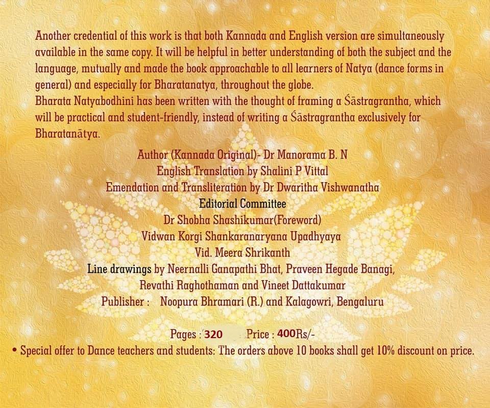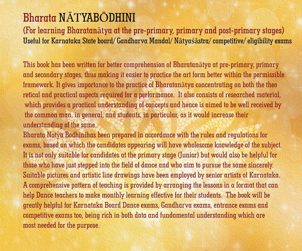 ಭರತ ನಾಟ್ಯಬೋಧಿನಿ- ಭರತನಾಟ್ಯವನ್ನು ಕಲಿಯುವ ಪ್ರಾಥಮಿಕ ಪೂರ್ವ/ಪ್ರಾಥಮಿಕ/ಪ್ರಾಥಮಿಕ ಅನಂತರ ಹಂತದವರಿಗಾಗಿ ನೃತ್ಯಾಭ್ಯಾಸ ನಡೆಸಲು ಅನುಕೂಲವಾಗುವಂತೆ, ಅರ್ಥ ಮಾಡಿಸಲು ಸುಲಭವಾಗುವಂತೆ ಈ ಕೃತಿಯನ್ನು ಬರೆಯಲಾಗಿದೆ. ಭರತನಾಟ್ಯದ ಅಭ್ಯಾಸ ಮತ್ತು ಪ್ರದರ್ಶನಕ್ಕೆ ಬೇಕಾದ ಶಾಸ್ತ್ರೋಕ್ತ ಪ್ರಯೋಗ ಸಂಸ್ಕಾರವನ್ನು ನೀಡುವುದರತ್ತ ಗಮನವಿರಿಸಿದೆ. ಆ ಮೂಲಕ ಪರೀಕ್ಷೆಗಳನ್ನು ತೆಗೆದುಕೊಳ್ಳುವವರಿಗೆ ಸಮಗ್ರವಾದ ನೃತ್ಯಾಧ್ಯಯನವು ಸಿದ್ಧಿಸುವಂತೆ ಈ ಪಠ್ಯವು ಸೂಕ್ತ ಪಠ್ಯನಿಯಮಗಳನ್ನು ಹೊಂದಿಸಿಕೊಂಡು ರಚಿತವಾಗಿರುತ್ತದೆ. ಕರ್ನಾಟಕದ ನೃತ್ಯಪರೀಕ್ಷೆ/ಗಂಧರ್ವ/ನಾಟ್ಯಶಾಸ್ತ್ರ/ಅರ್ಹತಾ/ಸ್ಪರ್ಧಾತ್ಮಕ ಪರೀಕ್ಷೆಗಳಿಗೂ ಉಪಯುಕ್ತವಾಗಿದೆ.