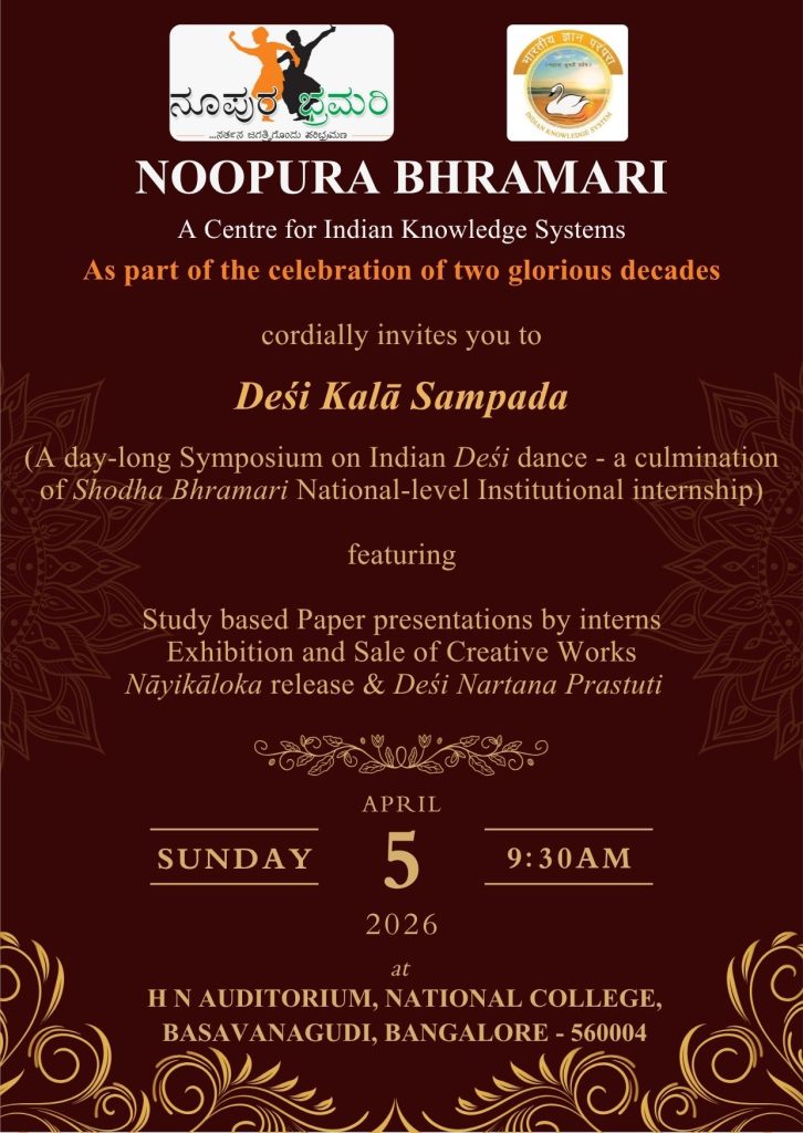 ಭಾರತೀಯ ಜ್ಞಾನಪರಂಪರೆಗಳ ಅಧ್ಯಯನ ಕೇಂದ್ರ ನೂಪುರಭ್ರಮರಿಯ 20ನೇ ಸಂವತ್ಸರದ ಪ್ರಯುಕ್ತ 5 ಎಪ್ರಿಲ್ 2026ರಂದು ಬೆಂಗಳೂರಿನ ಬಸವನಗುಡೀಯ ನ್ಯಾಶನಲ್ ಕಾಲೇಜಿನ ಎಚ್.ಎನ್. ಆಡಿಟೋರಿಯಂ ನಲ್ಲಿ ಆಯೋಜಿಸಲಾದ ದೇಶೀ ಕಲಾ ಸಂಪದ.