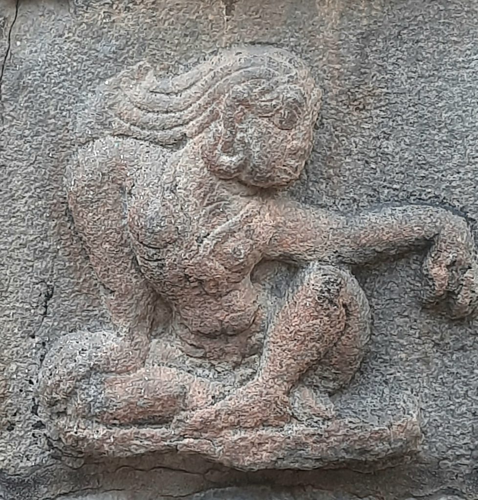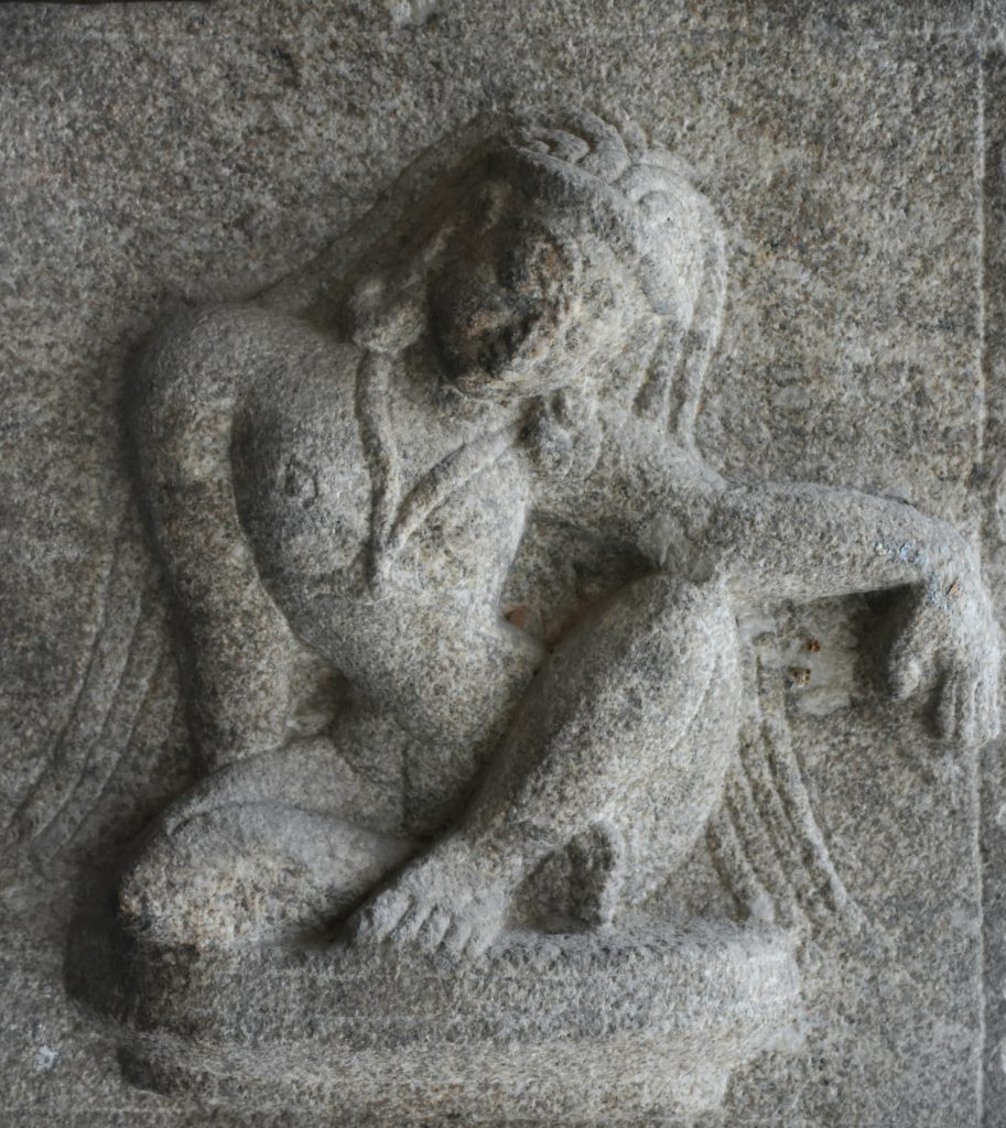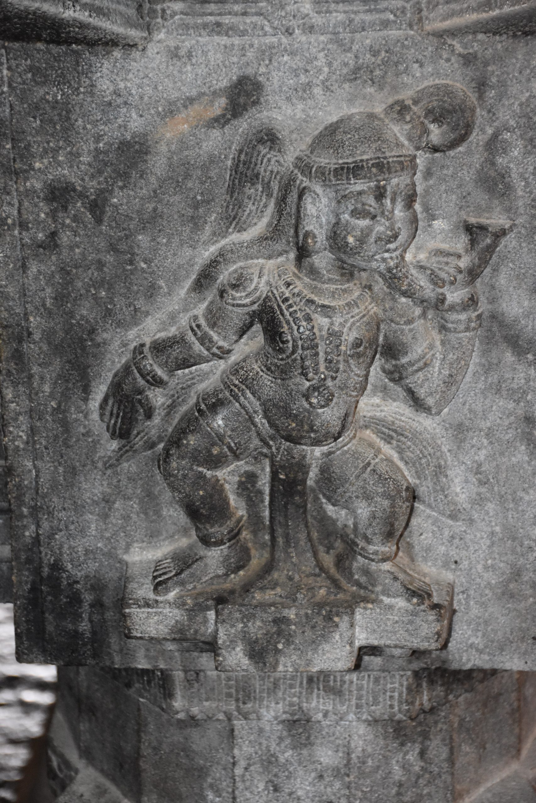Another female sculpture that is getting dressed in a long braid is also one such remarkable sculpture seen on one of the pillars near the Garbhagriha in Someshwara temple. Many female sculptures are seen getting dressed like this, most of the time, with their hair open, occasionally with a long braid.
