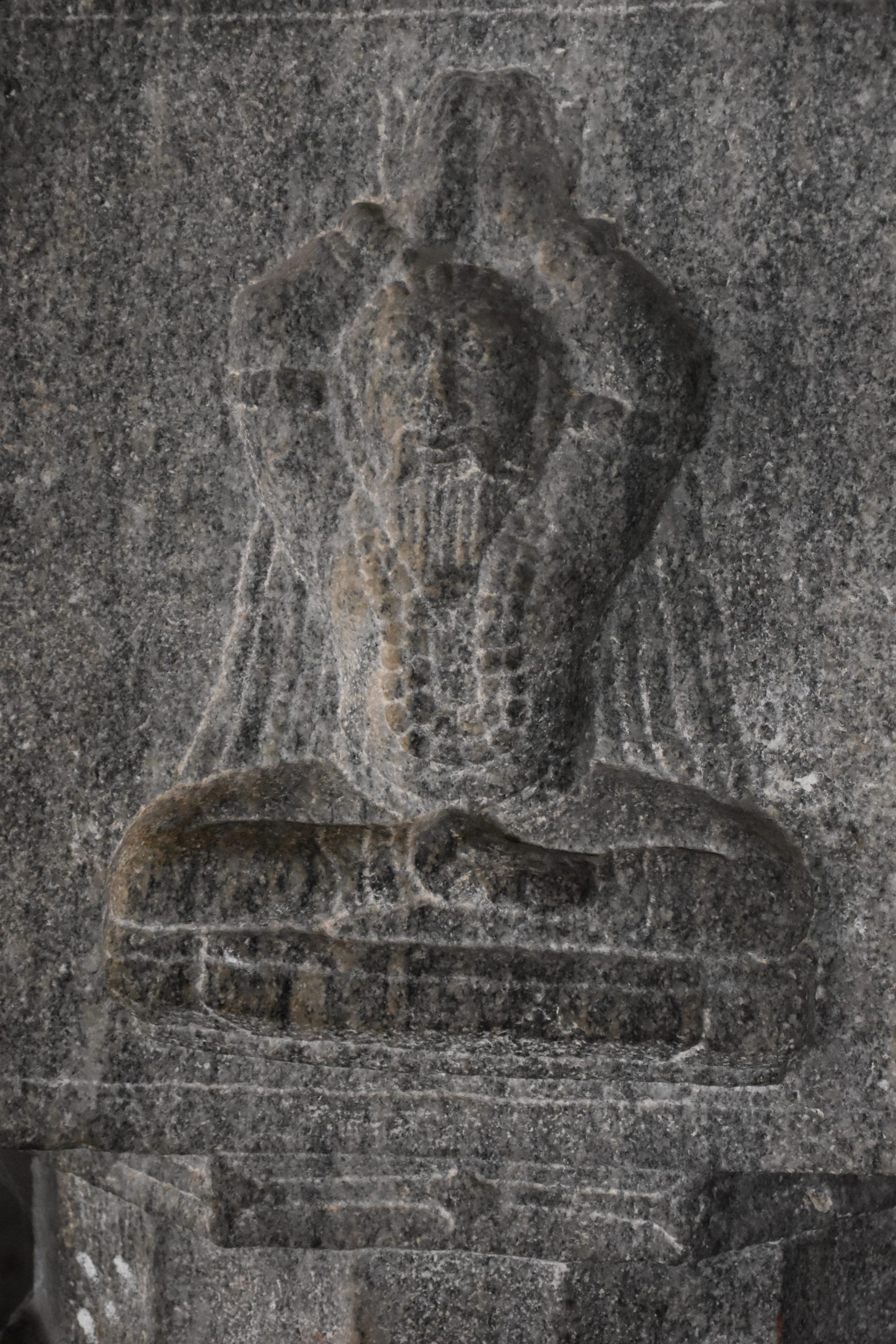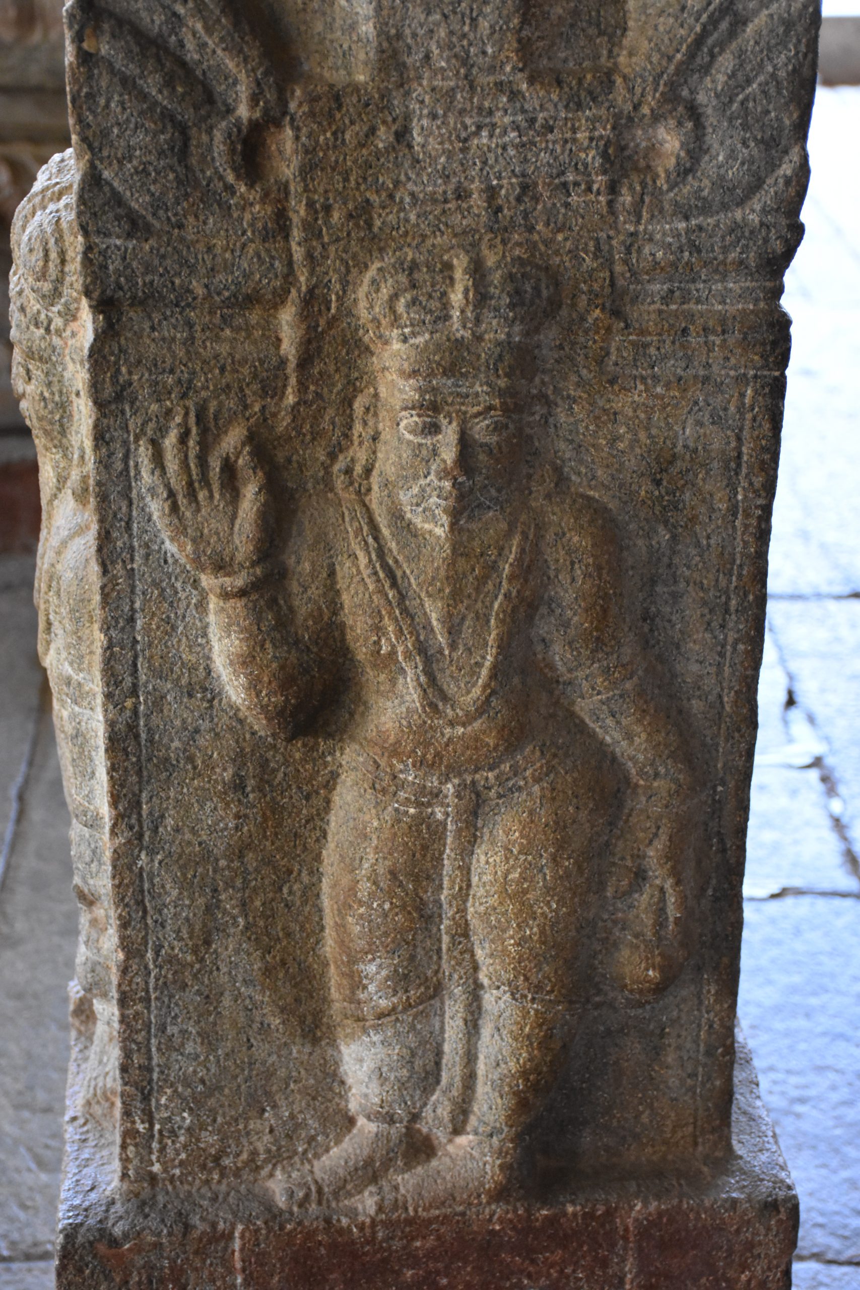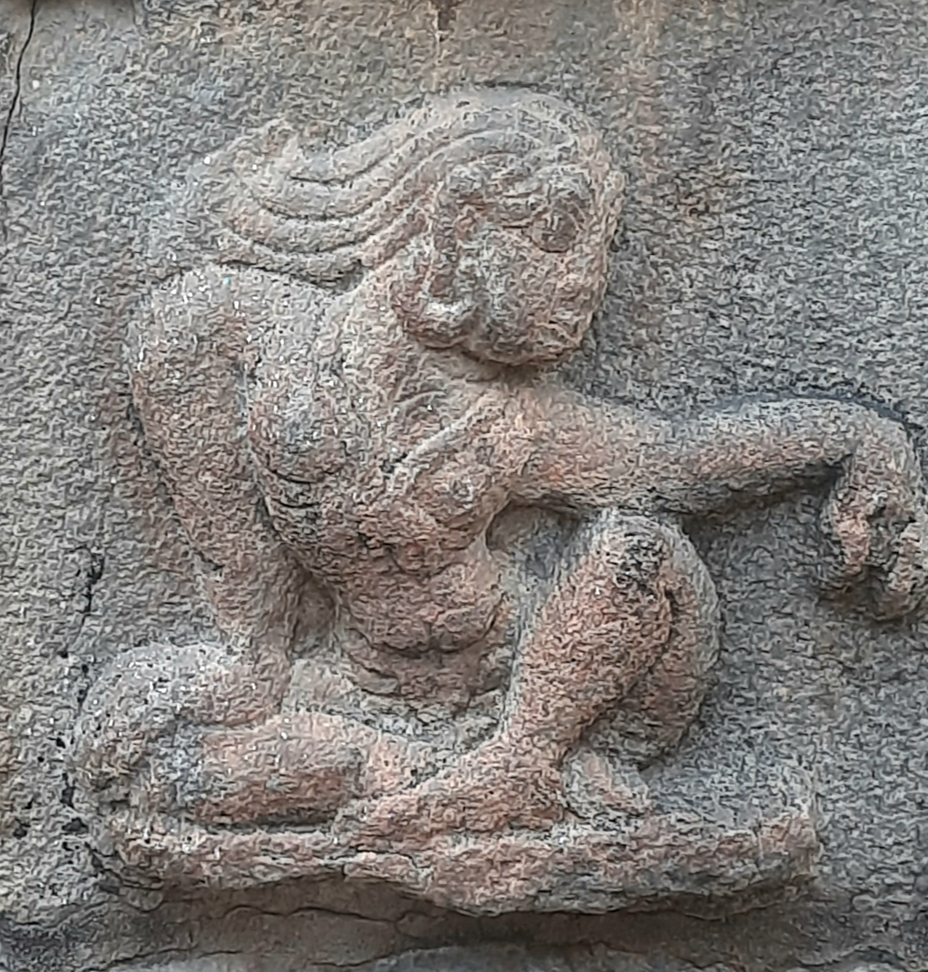 Another female sculpture that is getting dressed in a long braid is also one such remarkable sculpture seen on one of the pillars near the Garbhagriha in Someshwara temple. Many female sculptures are seen getting dressed like this, most of the time, with their hair open, occasionally with a long braid.