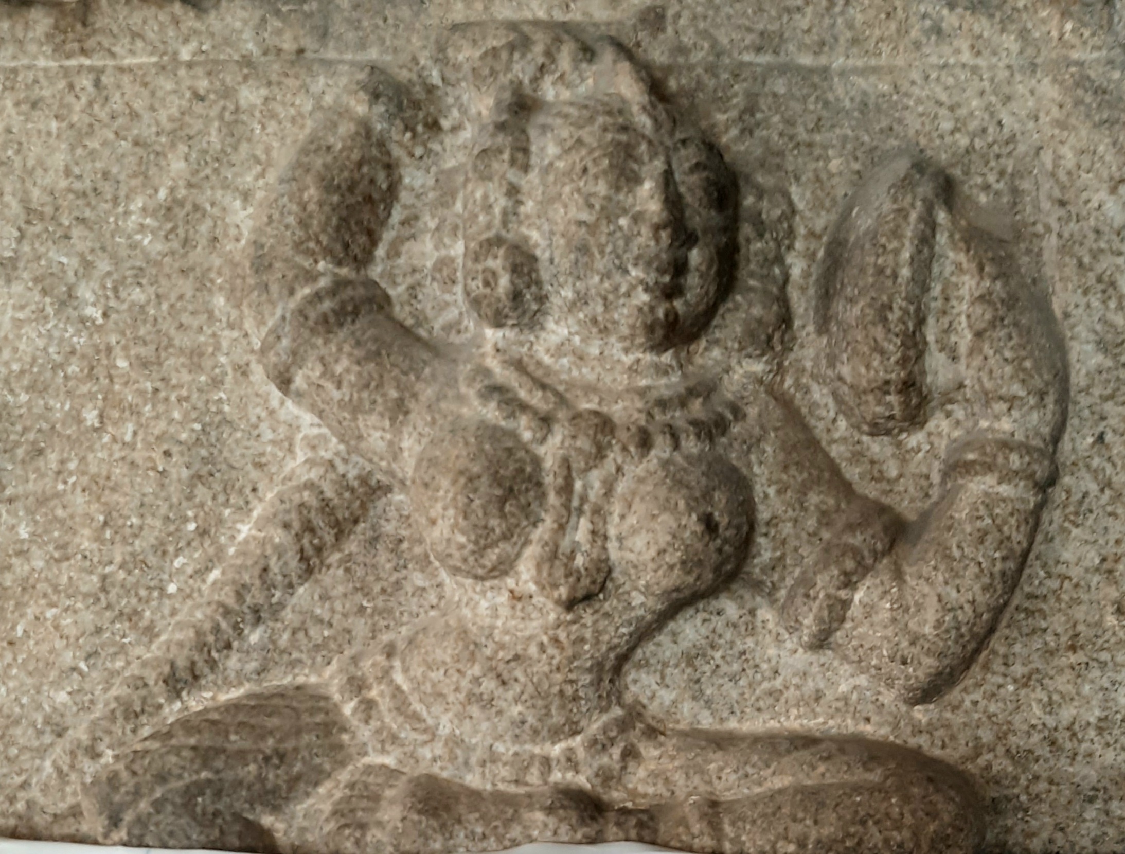 A sculpture in Bhoga Nandishwara temple has a unique hairstyle which is not often found. There is a bun tied at the side and the rest of the hair is left open. This hairstyle is being common in our society. The sculpture playing an instrument is also noticed.
