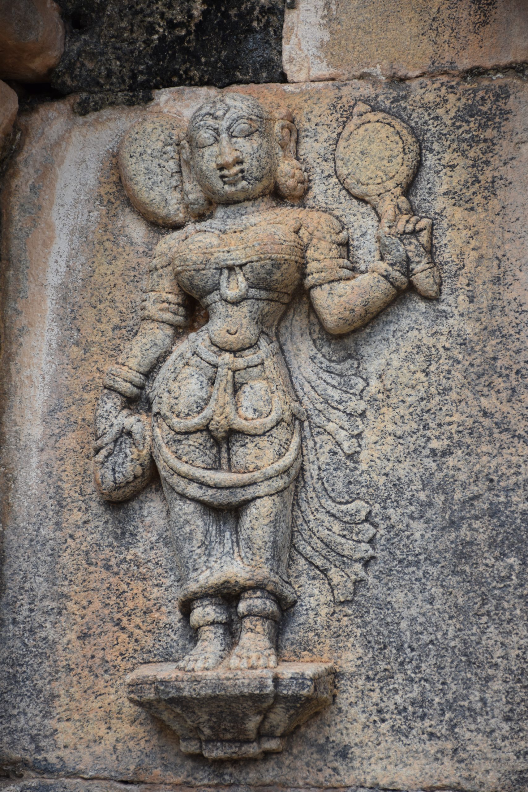 Female sculptures which have open hair and a single bun at the back, sides and top of the head are also seen in both temples. One of the sculptures here in the Bhoga Nandishwara temple show how the girl is getting dressed holding the mirror in her hand. Most of the female sculptures have a bun sculpted on them.