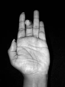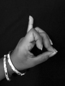 HAMSASYA – Sangita Ratnakara and Hastamuktavali share the same definition that the first three fingers held together while the last two are stretched out. Nartananirnaya fills the midfinger in the intervening space between the thumb and the forefinger.