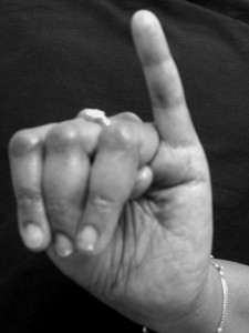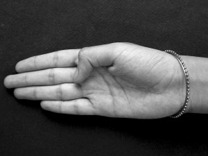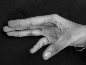 ARDHACHANDRA – The definition is similar in Sangita Ratnakara and Nartananirnaya. In Hastamuktavali with the same formation the fingers are bent in their places looking like a bow. The second version in Hastamuktavali is formed when the mid, ring and little fingers are in the fist and the forefinger and the thumb are spread out.