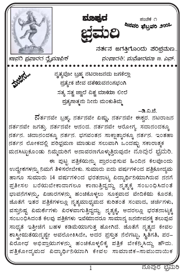 ನೂಪುರ ದ ಪ್ರಥಮ ಸಂಚಿಕೆ, ಶಿಶಿರ ಶೃಂಗಾರ ( ಜನವರಿ;ಫೆಬ್ರವರಿ ೨೦೦೭ ತಿಂಗಳಿನ) ಡೌನ್ ಲೋಡ್ ಮಾಡಲು ಇಲ್ಲಿ ಕ್ಲಿಕ್ಕಿಸಿ .