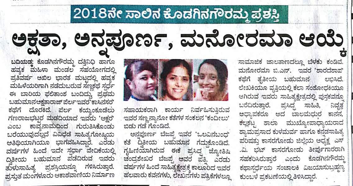 ಕೊಡಗಿನ ಗೌರಮ್ಮ ಪ್ರಶಸ್ತಿ- ಡಾ ಮನೋರಮಾಪತ್ರಿಕೆಗಳಲ್ಲಿ june 2018