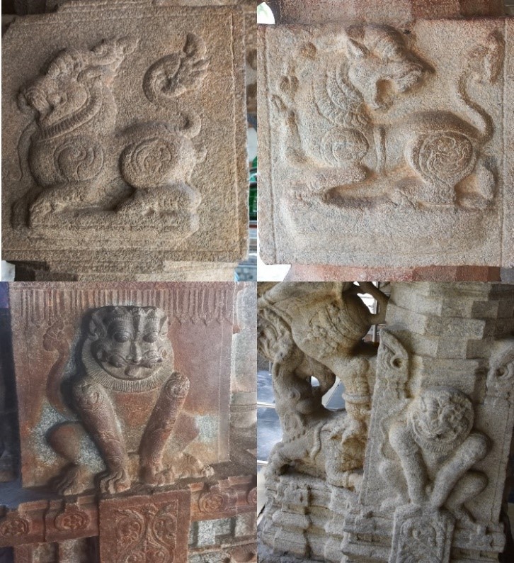 As shown in the above images we can see how one animal can be presented in a variety of forms. In Figure 1 a lion sits facing the Garbhagriha, in another, it looks back and roars; Figure 2 and Figure 3 show the lions sitting, facing front, all equally echoing the power showcased by the empires that contributed in the building of the temple. They can also be interpreted as a symbol of royalty; and countless other interpretations like the vast mind of the sculptor.