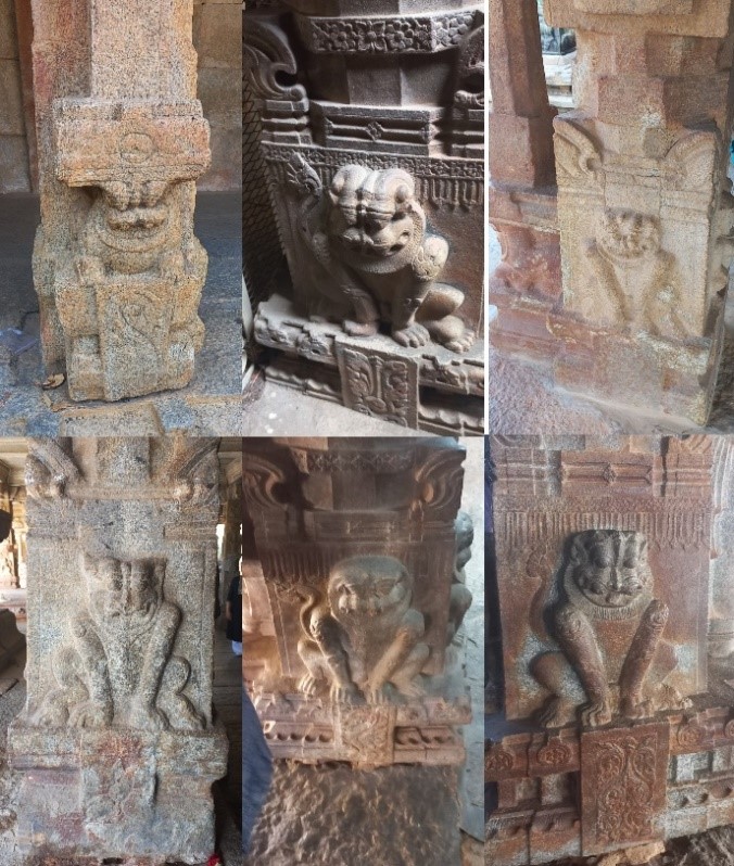 One notable feature is the repetition of lion figures on the lowermost section of the Sthambhas and pillars of the Mandapas (Pallava style) as a decorative element, in various patterns and styles.