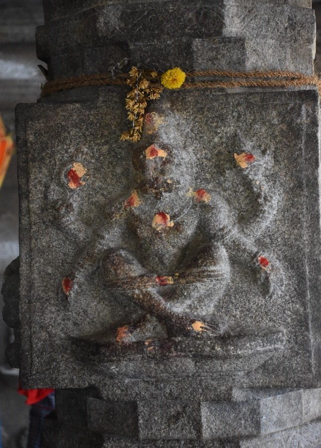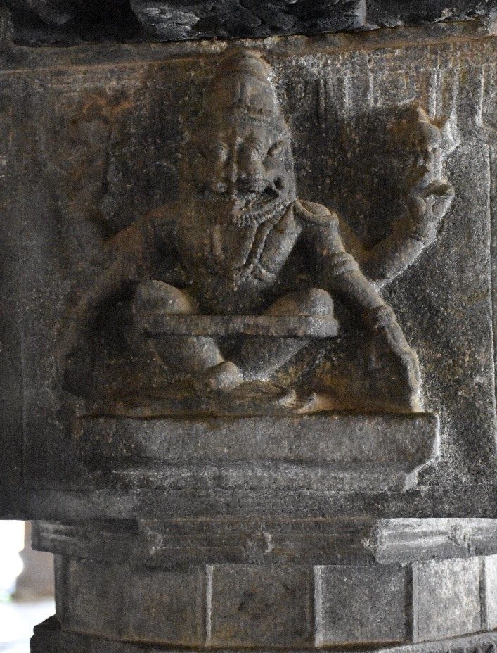 Narasimha is also described as the God of Yoga in our tradition. As seen in Figure 5 and Figure 6, both the temples have the Lord sitting in top most part of the Mandapa pillar in Yogapattasana, śaṅkha-cakra in rear hands and fore arms left free. Contradictory to the usual depictions of Ugra Narasimha, Yoga Narasimha has a divinely serene face of soumya bhāva.