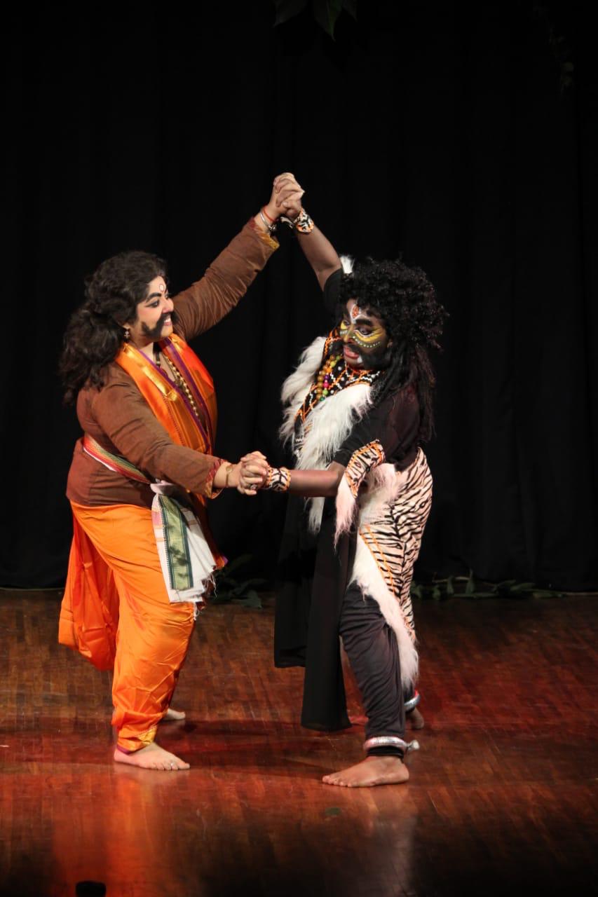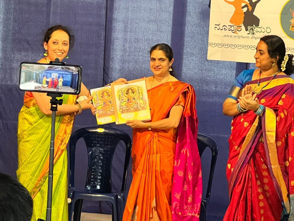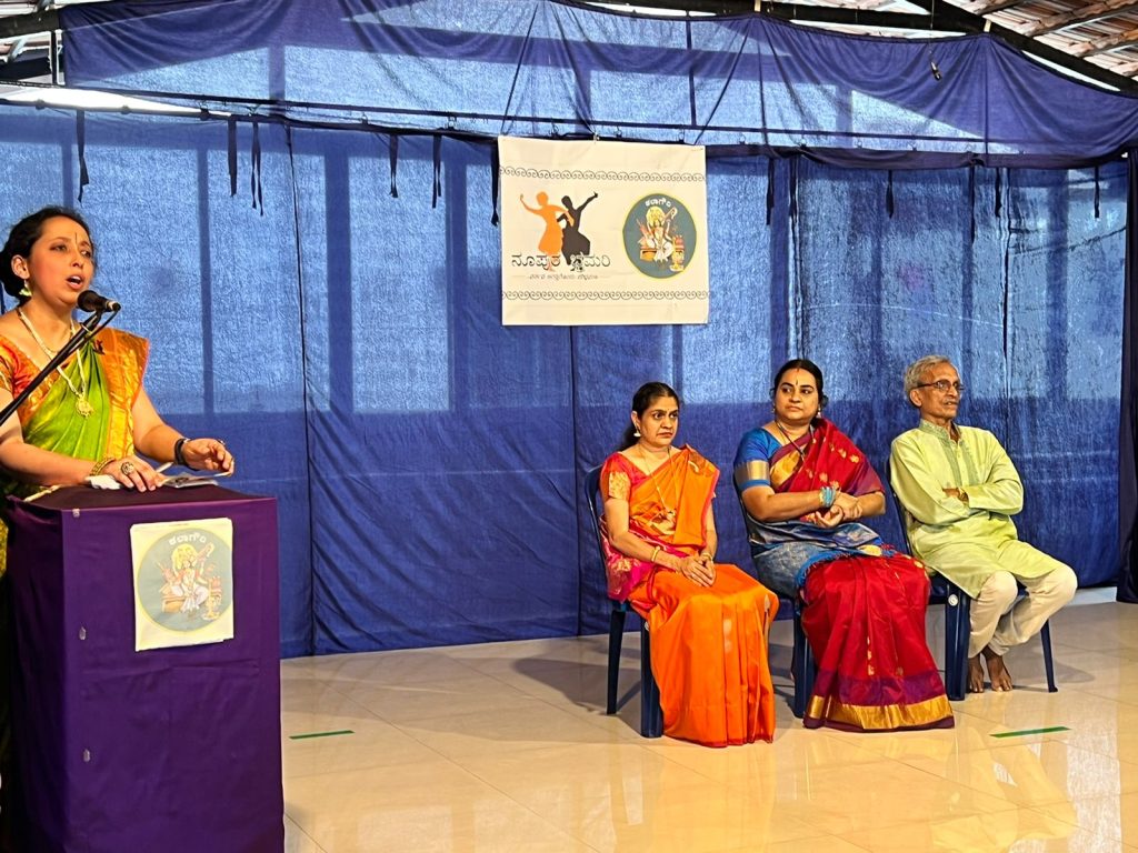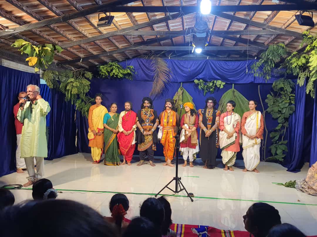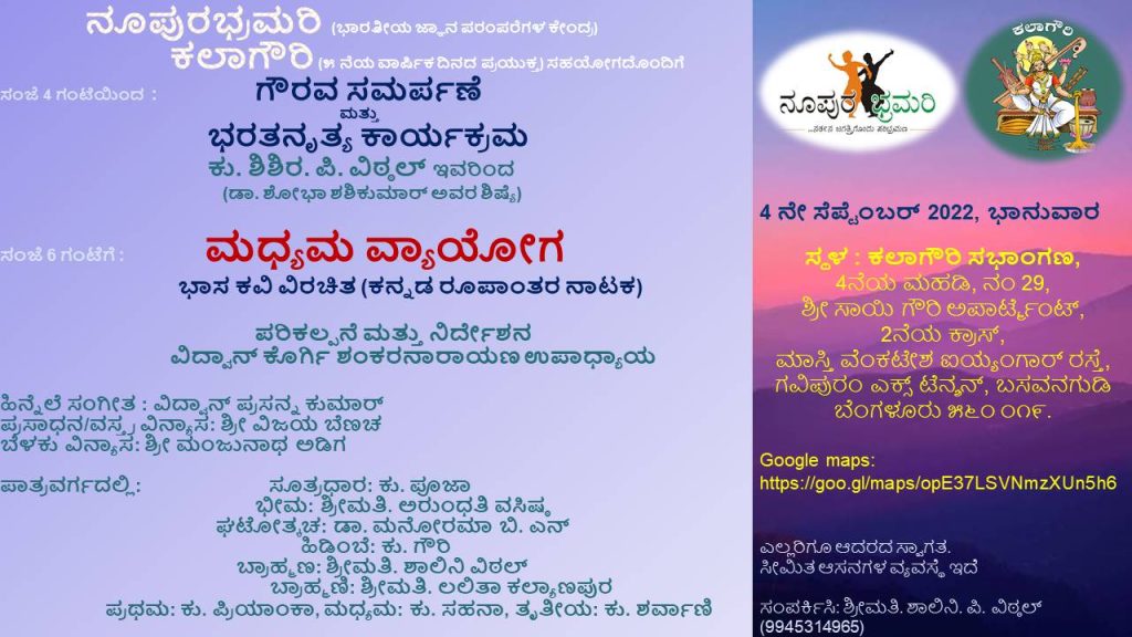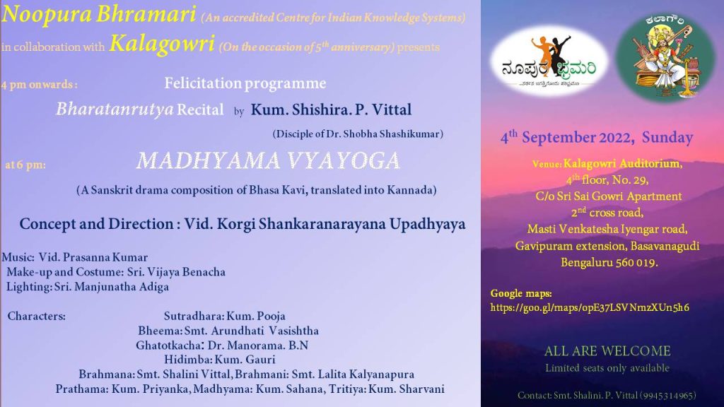 Madhyama Vyāyoga: Noopura Bhramari, in collaboration with Kalagowri, organized a Felicitation Program to the dancers of Akhanadam bharatam smaret, who has participated in IKS Mela and performed on 2022 July at New delhi AICTE Auditorium. Programme also featured a Bharatanṛtya recital by Kum. Shishira P. Vittal, followed by ‘Madhyama Vyāyoga’, a Kannada adaptation of the Sanskrit drama by Bhāsa Mahākavi, on 4th September 2022 at Kalagowri Auditorium. The drama was conceptualized and directed by poet and theatre personality Vid. Korgi Shankaranarayana Upadhyaya, with music by Vid. Prasanna Kumar, make-up and costumes by Sri Vijaya Benacha, and lighting by Sri Manjunatha Adiga.