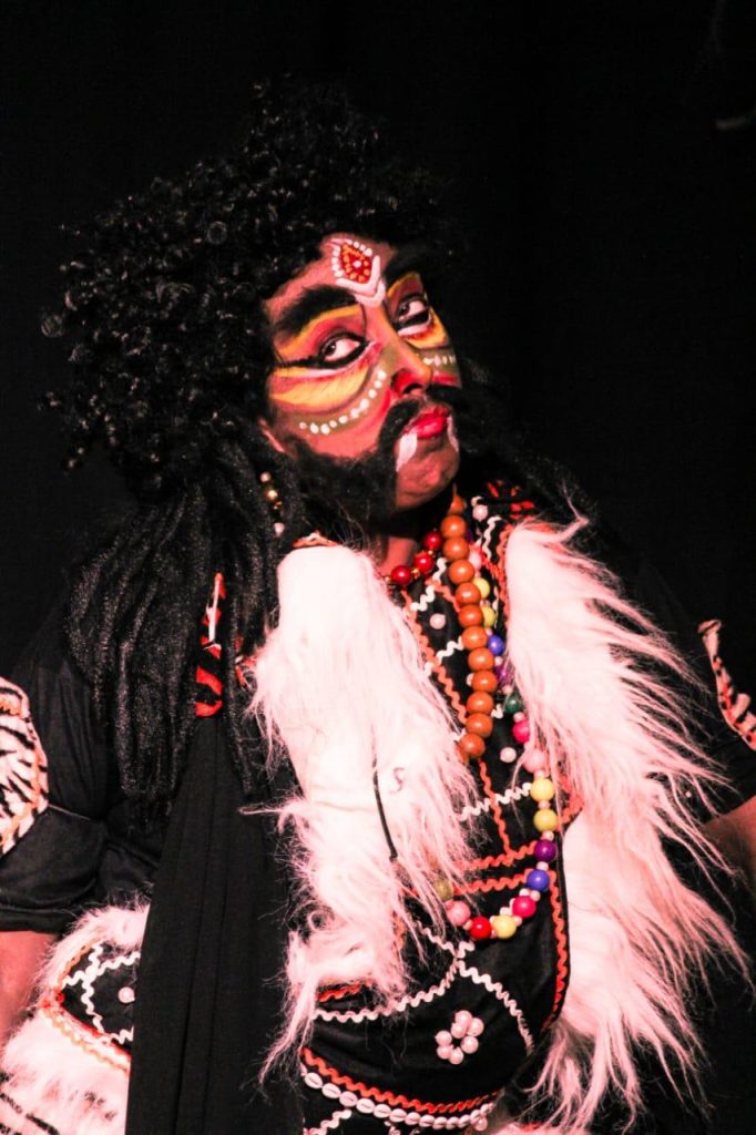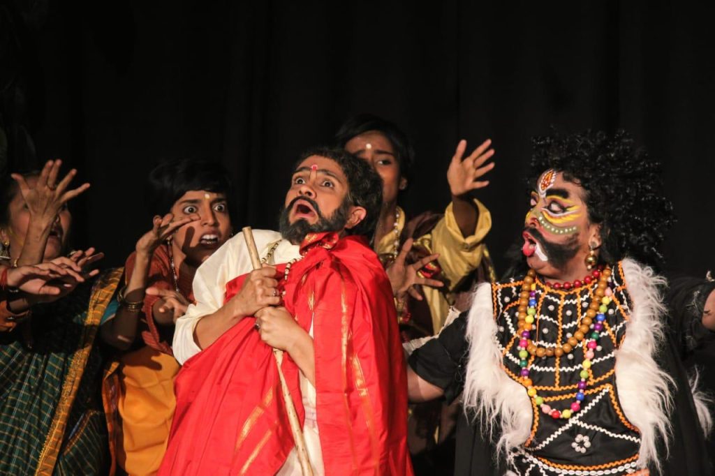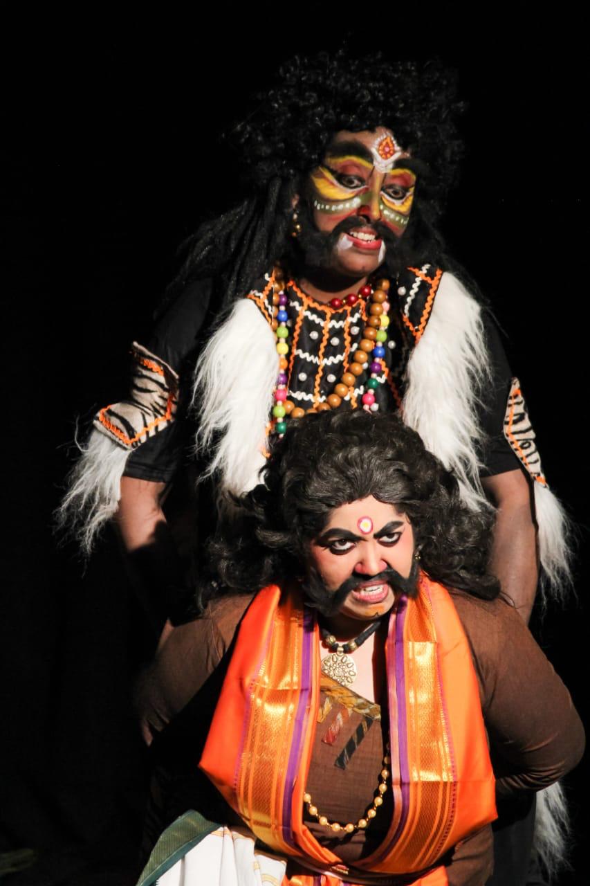 Selected 10 participants underwent an intensive 8+4-day training program to master the ancient drama, incorporating contemporary elements into their performance. The primary objective was to immerse participants in the Nāṭyaśāstra-based theatre traditions. The performance was well received by the audience, leading to six additional shows in reputed venues, all performed to packed houses. Notably, the play was staged at Shiva Gurukukam of Vishnugupta University, Gokarna, as part of an edutainment and knowledge dissemination program for 500 university students. PI Dr. Manorama B.N. and Dr. Shalini Vittal played pivotal roles as Ghatotkacha and Brahmana, respectively, while Kum. Sahana, an intern of the Nṛtyaśilpa Yātra program, performed as Madhyama.