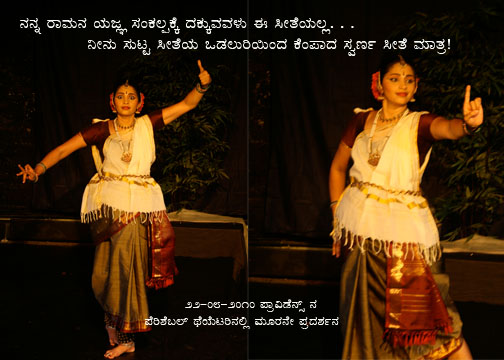 ಮಾತು: ಸಾರ್ವಭೌಮತ್ವದ ಅಶ್ವಮೇಧವನ್ನು ನೀನು ಸಂಕಲ್ಪಿಸಿದರೆ ರಾಮ, ನೀರೆರೆಯಲು ಇನ್ನು ನಿನ್ನ ಬಳಿಗೆ ನಾ ಬರಲಾರೆ. . . ಚಿನ್ನದ ಜಿಂಕೆ ತರಲು ಸೋತು ಚಿನ್ನದ ಲಂಕೆಯನ್ನು ಗೆದ್ದು ಕೈಹಿಡಿದವಳನ್ನು ಅಗ್ನಿಪರೀಕ್ಷೆಗೊಳಪಡಿಸಿದ ನನ್ನ ರಾಮನಿಗೆ. . .
