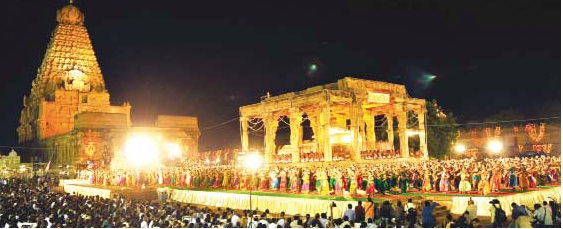 ಚೋಳರ ಅರಸ ರಾಜ ರಾಜ ಚೋಳನಿಂದ ಕ್ರಿ.ಶ.೧೦೧೦ನೇ ಇಸವಿಯಲ್ಲಿ ನಿರ್ಮಿತವಾದ ಈ ದೇವಾಲಯಕ್ಕೆ ರಾಜರಾಜೇಶ್ವರನ್ ದೇವಸ್ಥಾನವೆಂಬ ಹೆಸರೂ ಇದ್ದು ; ಇದು ವಿಶ್ವದ ಪ್ರಪ್ರಥಮ ಸಂಪೂರ್ಣ ಅಮೃತಶಿಲಾ ದೇಗುಲವಾಗಿದೆ. ನಂದಿ ಮಂಟಪದಲ್ಲಿ ಅಲಂಕೃತ ಬೃಹತ್ ನಂದಿ ವಿಗ್ರಹದ ಸುತ್ತಲೂ ಆಯೋಜಿಸಲಾಗಿದ್ದ ಈ ಬೃಹನ್ನಾಟ್ಯಯಜ್ಞದಲ್ಲಿ ಗಣೇಶ ಕೌತ್ವಂನಿಂದ ಮೊದಲ್ಗೊಂಡು ನಂತರ ಕರೂರು ತಿರುವಿಸೈಯಪ್ಪ ಕಾವ್ಯದಿಂದ ಆಯ್ದ ೧೦ ಸಾಲುಗಳನ್ನು, ಶಂಕರಾಚಾರ್ಯ ವಿರಚಿತ ಶಿವ ಪಂಚಾಕ್ಷರಿ ಮುಂತಾದ ಭಕ್ತಿಪೂರಿತ ನೃತ್ಯ ಬಂಧಗಳನ್ನು ಕಲಾವಿದರು ಏಕಪ್ರಕಾರವಾಗಿ ನರ್ತಿಸಿದರು.