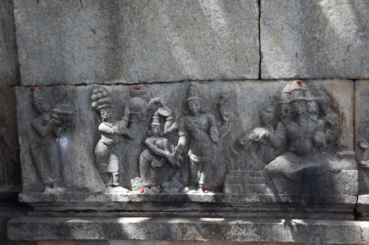 In the Panel at the right most corner we see Lord Bramha, his three heads out of four are visible. Next to Bramha, Lord Vishnu is seen blessing Shiva and Parvathi, in his right hand he is holding pataka and dola in the left, we can see he has Shanka and Chakra. Next to him, is the groom, Lord Shiva wearing a Kirita and holding a deer and an axe. His left hand depicts Varada hasta, bestowing boons to his devotees and right in Dola. Probably a small Nandi is seen near his right hand.