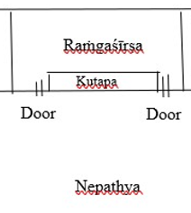 The musicians enter the performance area with a white curtain held in the front and with lamps held using bamboo stick by two people. On entering the stage, the musicians (vocal, percussion, cymbal, harmonium player and flutist) taking their respective seats is Pratyahāra[5] and Avatarana[6] of Pūrvaraṅga vidhi of Nāṭyaśāstra; the former is arrangement of musical instruments and the latter is musicians taking their respective seats. There are delineations in the positioning of the musicians. In a Sattra, the musicians are seated in the backend-centre of the performance area; in front of the Nepathya screen and the play happens in front of them. This is similar to the position of the drums on the stage mentioned in Nāṭyaśāstra[7]. A pictorial representation of the same is given below: